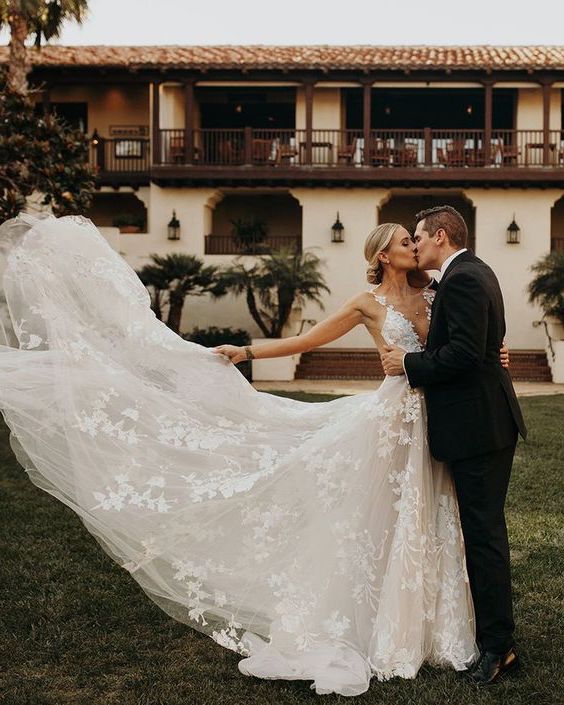 get in close, groom, put your hands on her back. bride, take your right hand and grab onto your train. turns towards me a little. assistant, grab onto the end. on 3, throw the train up and back away.