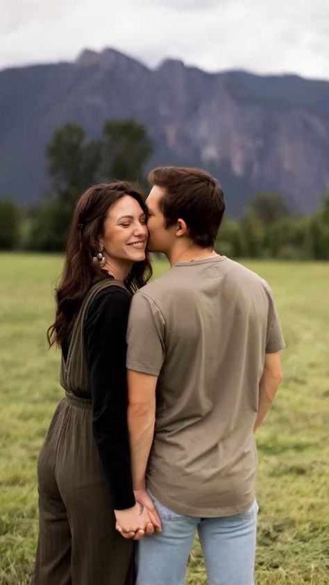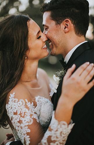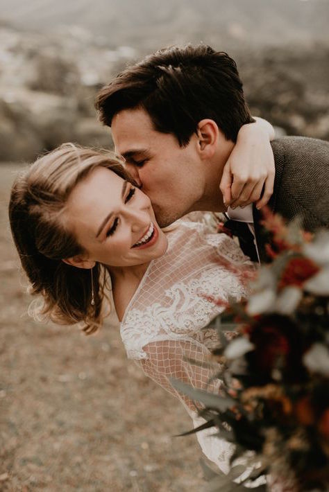 bride, get in close, and put your right hand on his chest, your left hand around his neck. groom, put your hands on the small of her back, lean in to the right and kiss her left cheek.