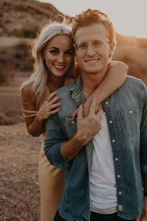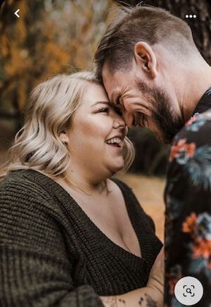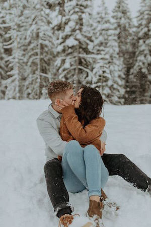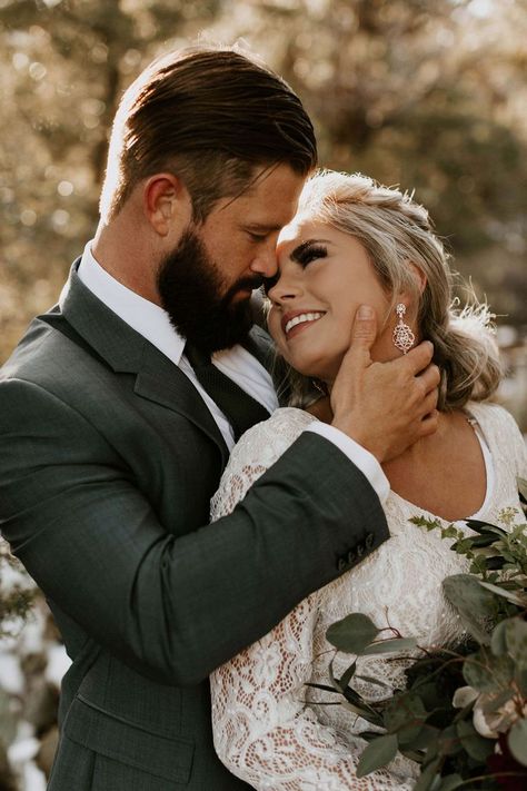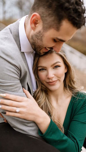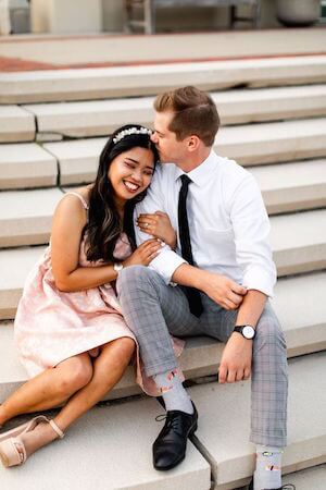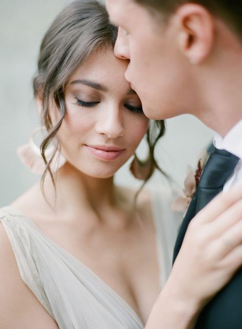 groom, put your right hand in your pocket, thumb tucked in, your left on her hip. feet shoulder width apart, then tilt your forehead towards her. bride, let your left hand hang down and relax, then take your right hand and reach up to the back of his head, and pull him in. lean to your left a bit, and touch your forehead to his.