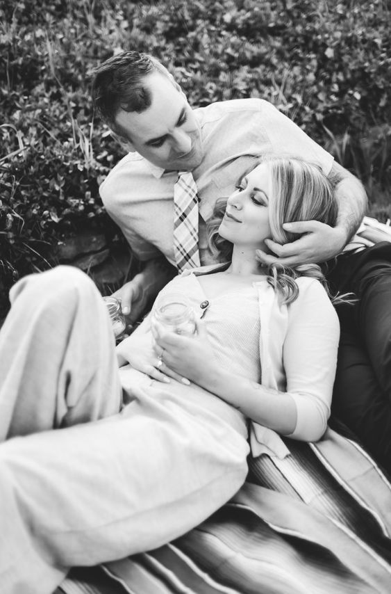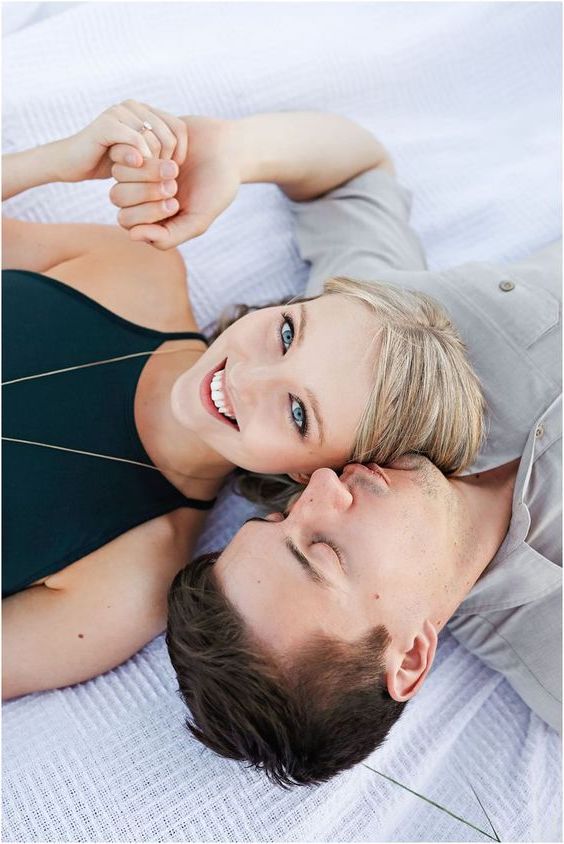 groom, lay down and prop yourself up on your right elbow. bride, lay down so your head is by his waist, and lace your fingers. groom, put your left hand in her hair.