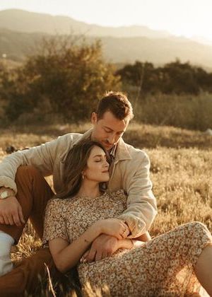groom, sit with your left leg out straight, right leg bent up. bride, sit about a foot away from him and lean back into his lap. put your left hand on your waist. groom, put your right arm around your knee, and hold her left hand with yours. bride, put your right hand on his wrist.