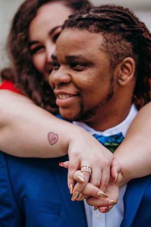 groom, stand behind her. take your right hand and hold her right hand. take your left hand and put it around her neck and over her chest. bride, take your left hand and intertwine your fingers, so I can see your ring.