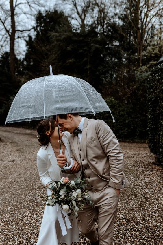 groom, keep your left hand in your pocket, right hand on the umbrella. bride, stand on his right, put your left hand on his arm. try to slowly walk towards me in sync while looking at each other