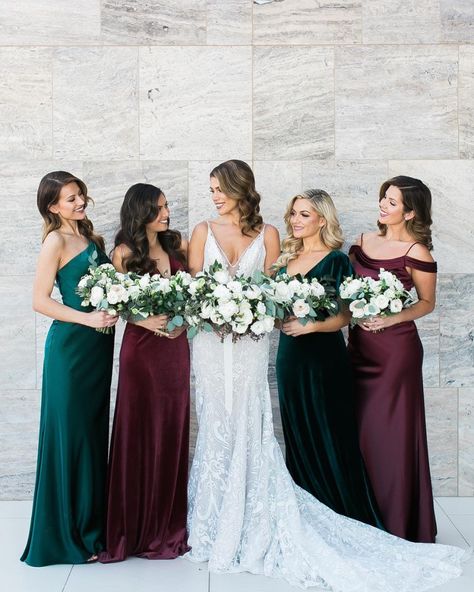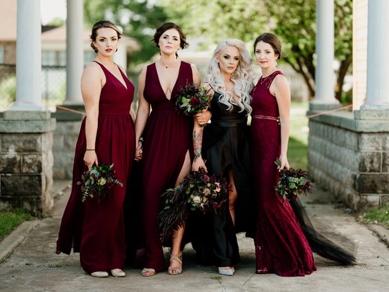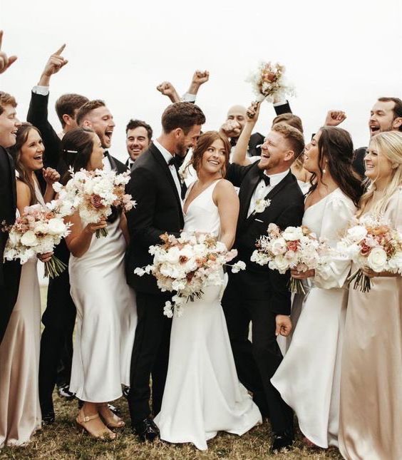 bride, give me a power stance, legs shoulder width apart, bouquet down. bridesmaid, link arms with the bride. other bridesmaids on the end, turn your body sideways, and put your weight on your back foot, bouquets down.