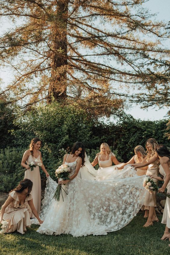 everyone, I want you space yourself evenly around the bridge and grab a bit of her train. bride, I want you to look backward over your shoulder at them.