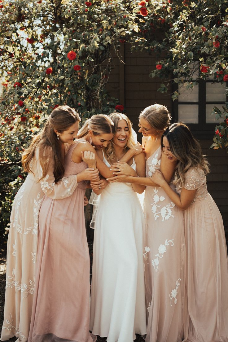 gather in close, and bring your hands up and hold on to the upper part of the arm of the person in front of you. bridesmaids in the middle, wrap your arms around the bride.