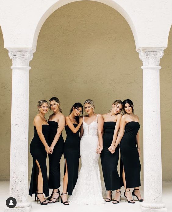 bridesmaids on the end lean forward further, bridesmaids in the middle don't lean at all, bride looks to one side.