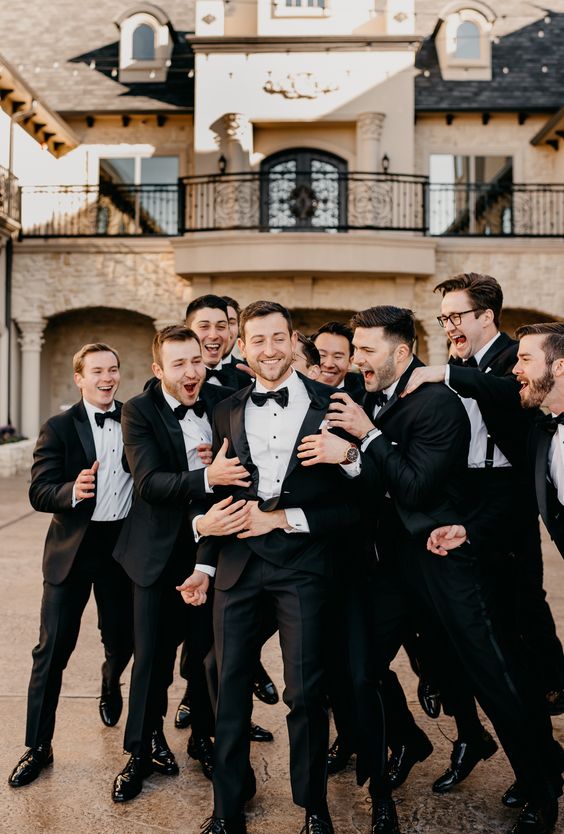 on the count of three, I want all the groomsmen to come in for a bear hug around the groom.