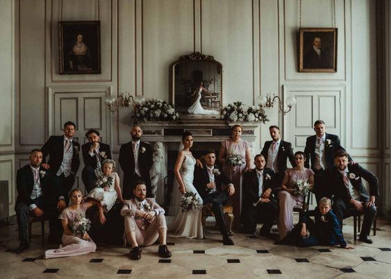 pair people who know each other. from the ends, pair off. some hold hands facing each other, some with backs to each other. if there's an odd bridesmaid in the middle, they cuddle up to the bride.