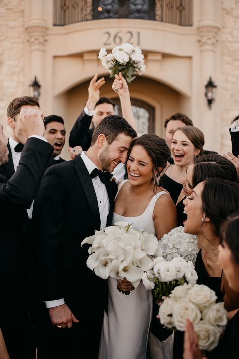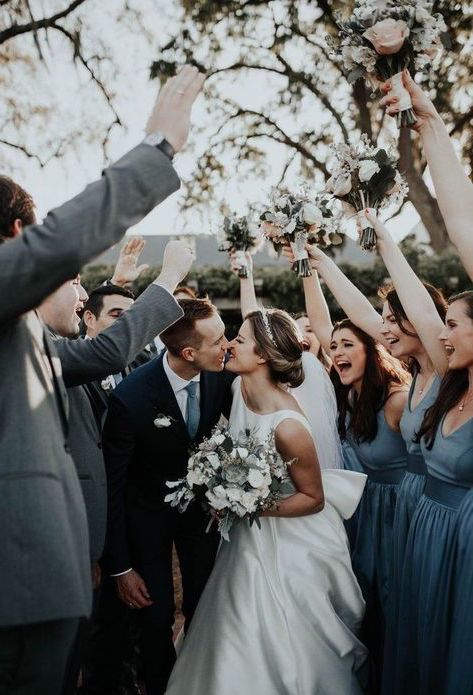bridesmaids on one side, groomsmen on the other. bridesmaids, hold your bouquets up, groomsmen, just clap or wave your hands.