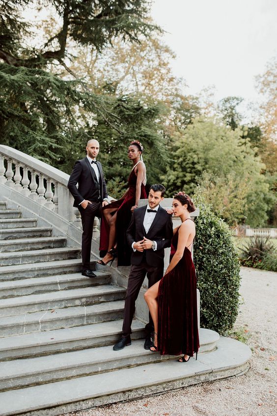 bridesmaid in front, right foot on lower stair, left on upper. groomsman in front stand facing me, lean towards her a little. bridesmaid, put your right hand on his shoulder.